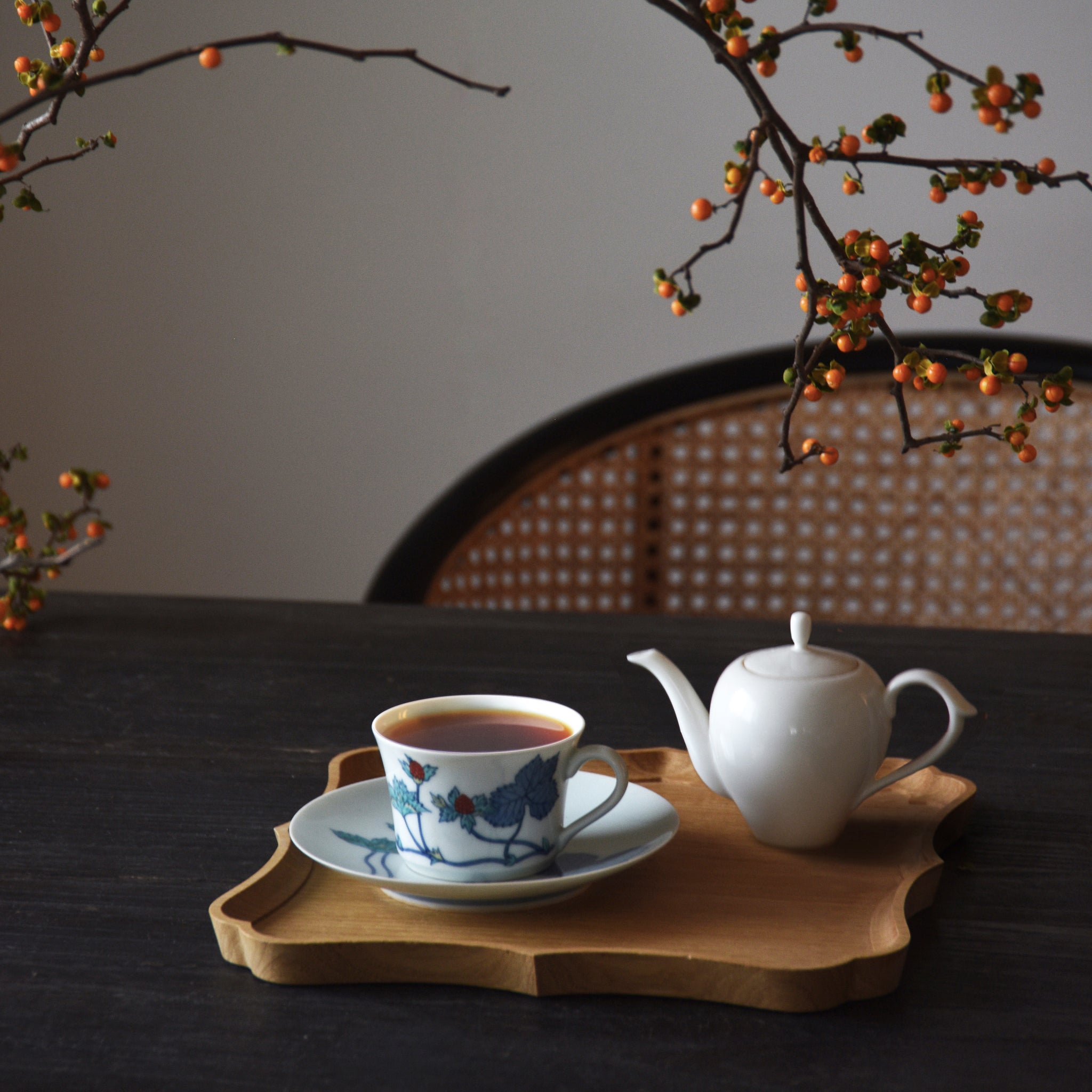 稜花とは花弁の先が尖った花を指します。角盆ながら曲線を多用した優雅な形状は、どこか東洋的な雰囲気もあり、和洋問わず乗せるうつわや菓子を引き立て華やかに卓上を演出します。