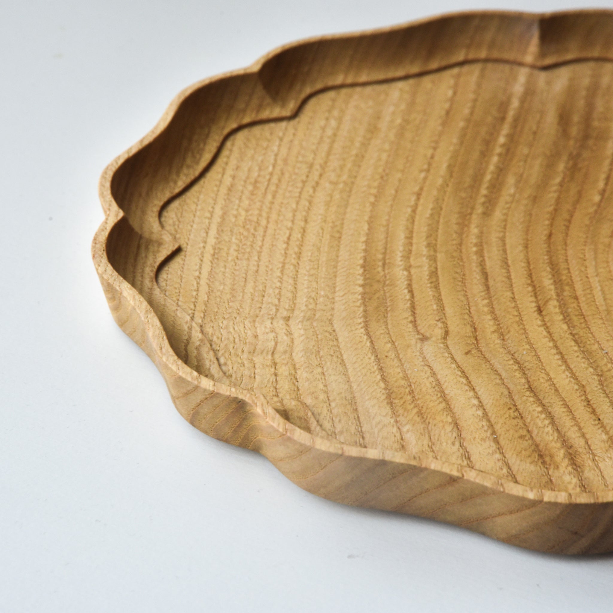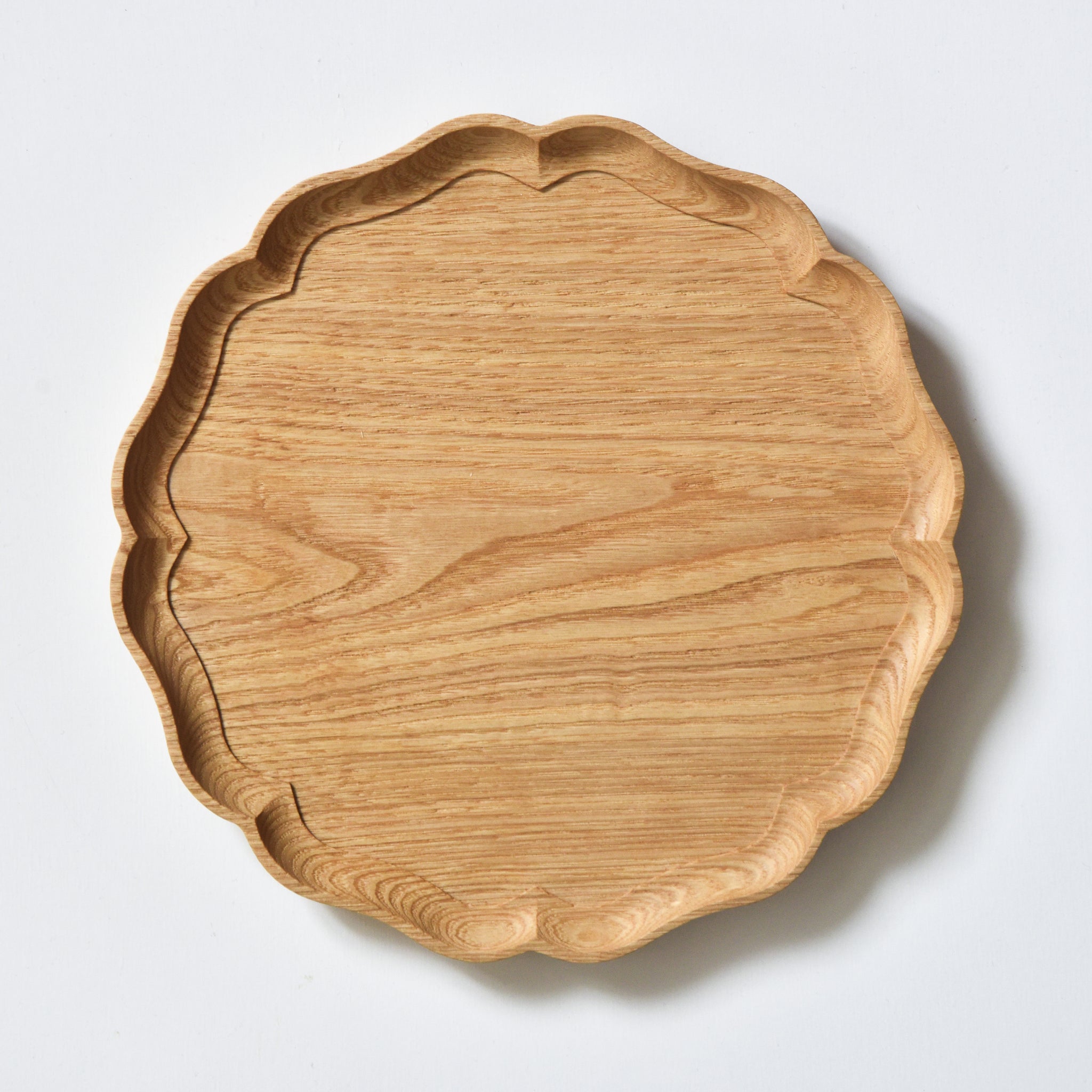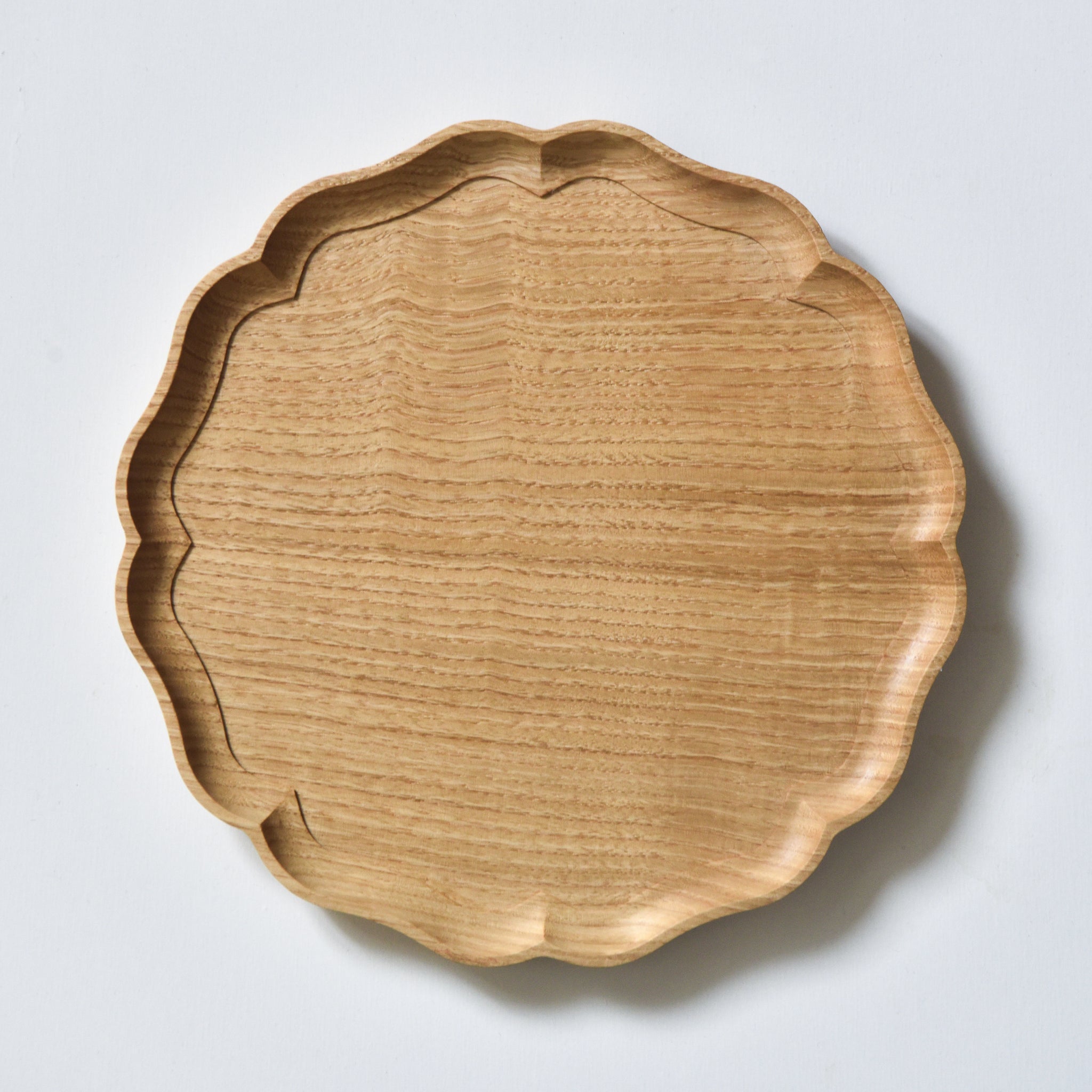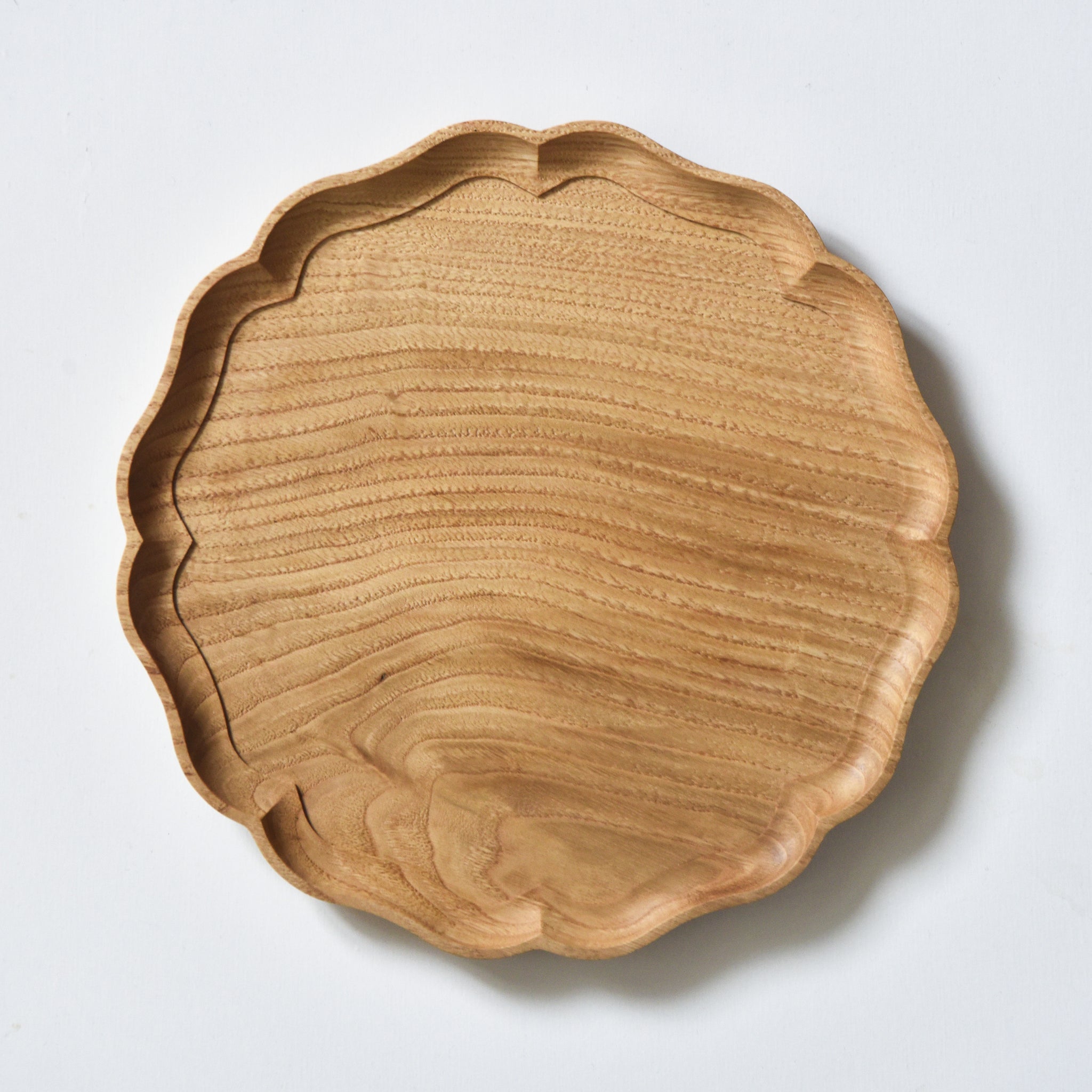 古い漆器に見られる輪花の形状を参考にした、古風な雰囲気のあるお盆です。波打つようなやわらかい形状が特徴の輪花は、もともと芙蓉の花など大輪の花をモチーフにした形状で、その優雅な形状から古来より漆器やうつわが作られてきました。山形県の木工房で栗の無垢材を削り出し、一つ一つ手作業で丁寧に仕上げております。