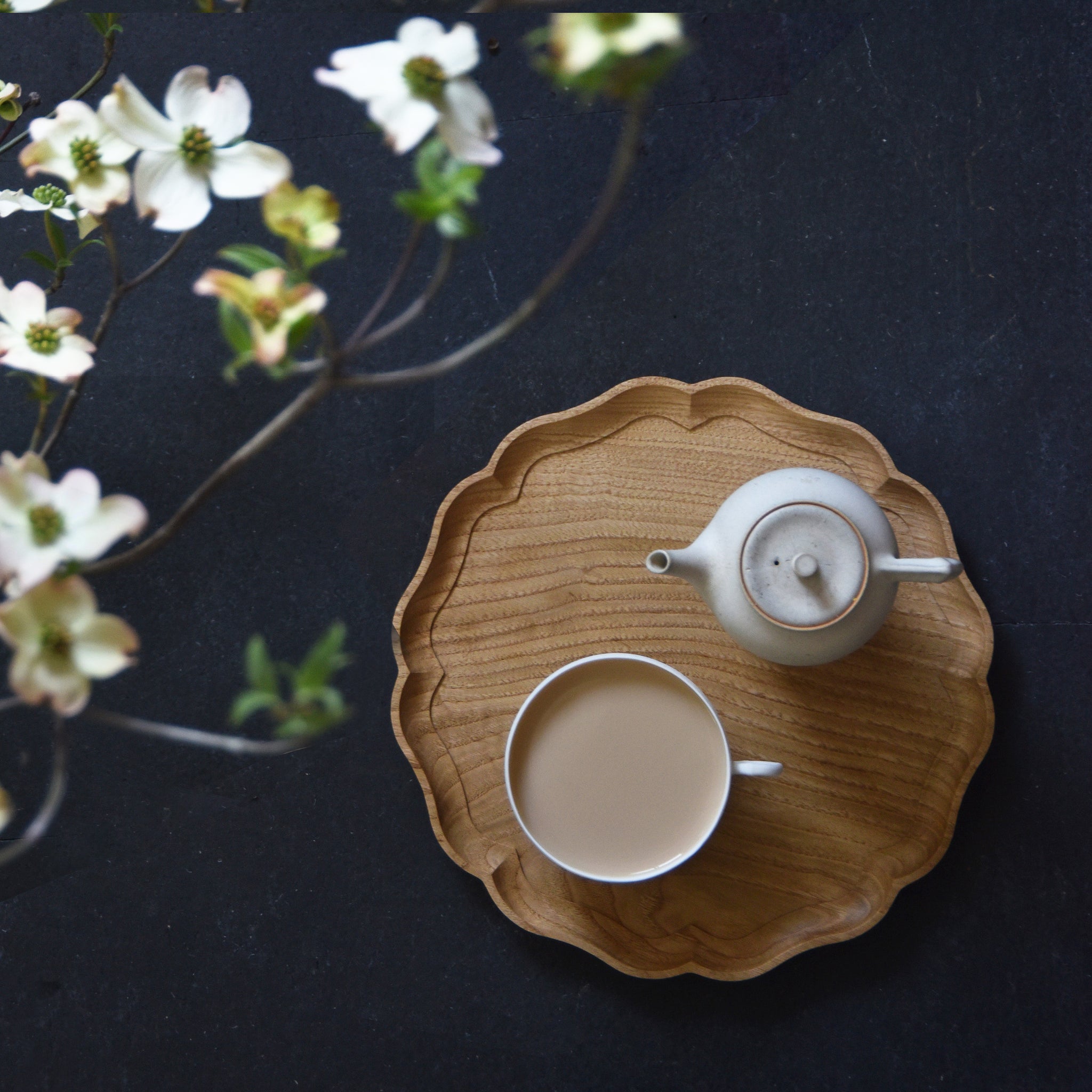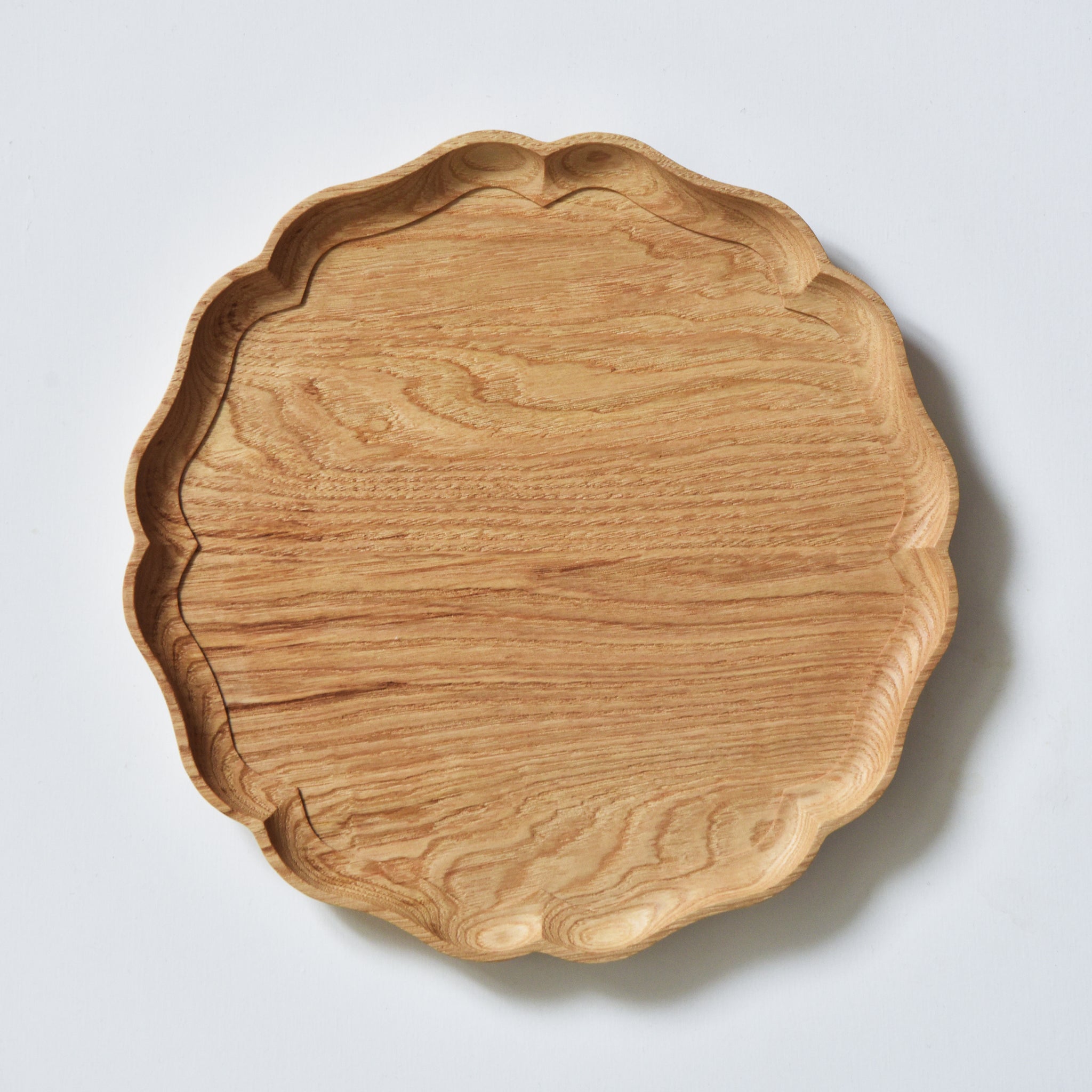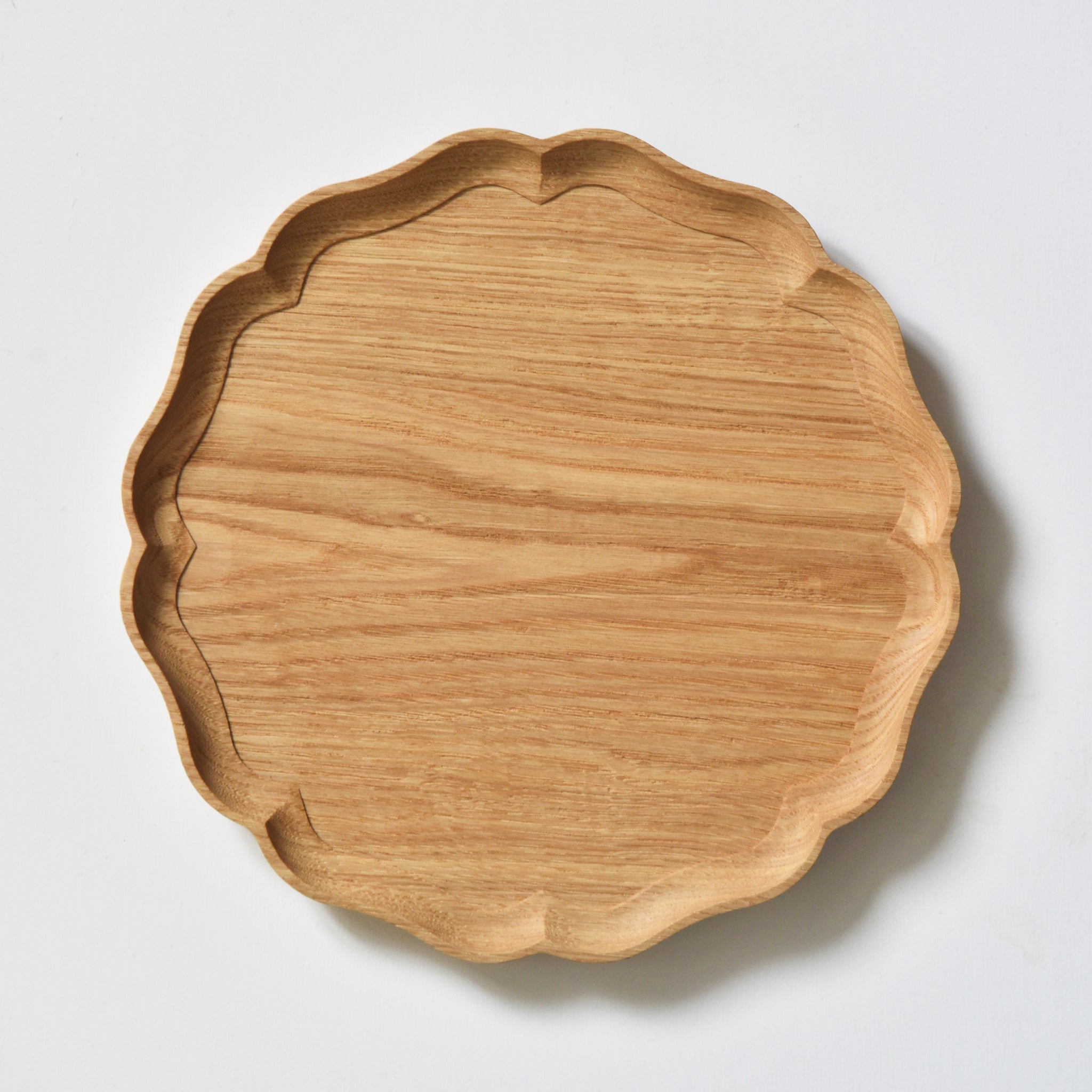 古い漆器に見られる輪花の形状を参考にした、古風な雰囲気のあるお盆です。波打つようなやわらかい形状が特徴の輪花は、もともと芙蓉の花など大輪の花をモチーフにした形状で、その優雅な形状から古来より漆器やうつわが作られてきました。山形県の木工房で栗の無垢材を削り出し、一つ一つ手作業で丁寧に仕上げております。