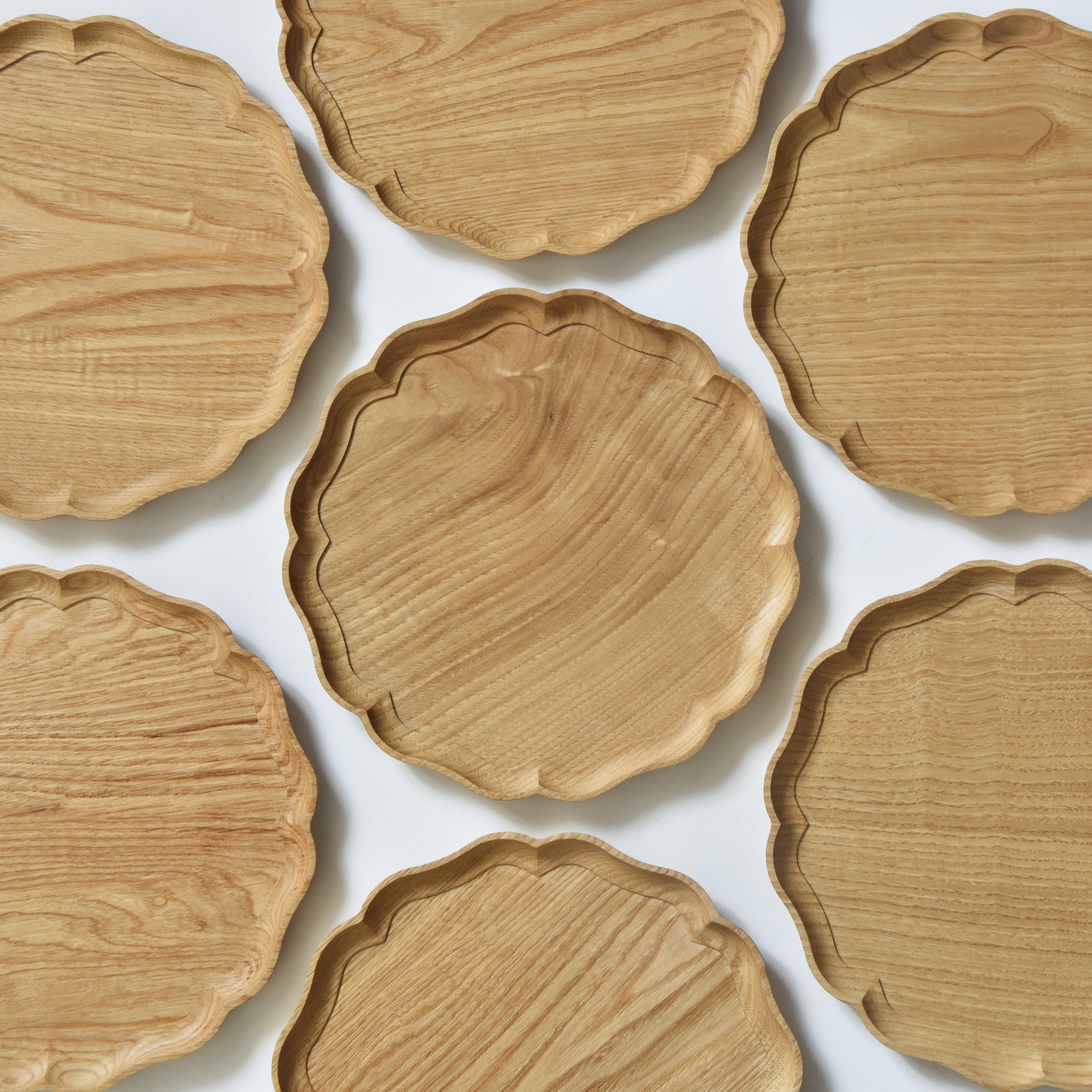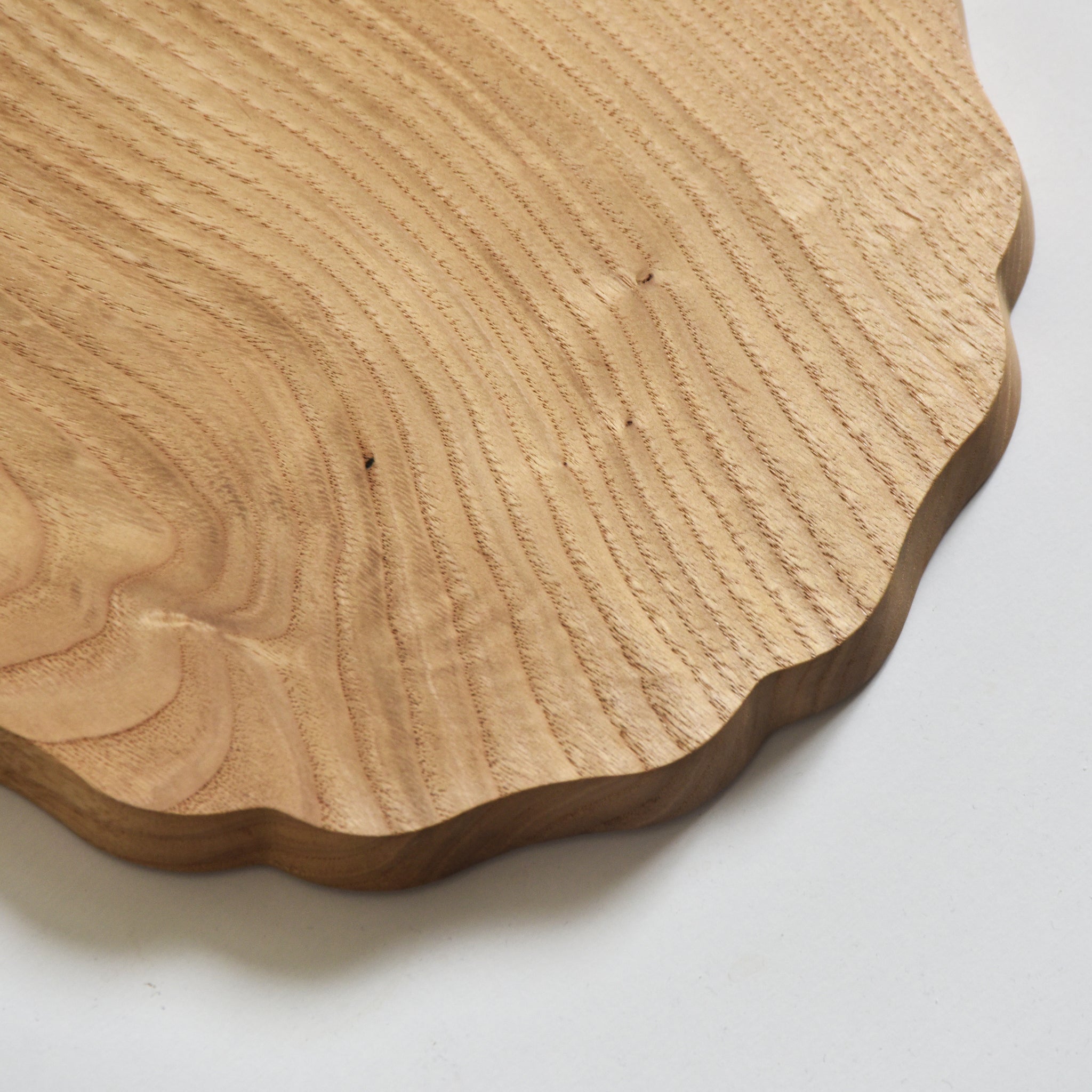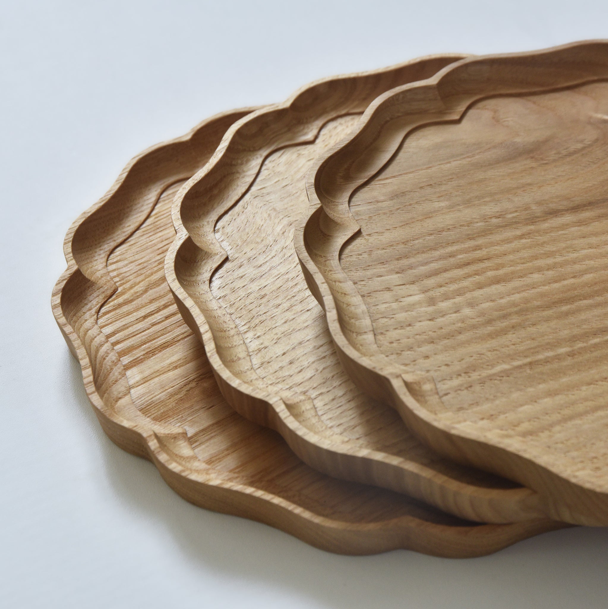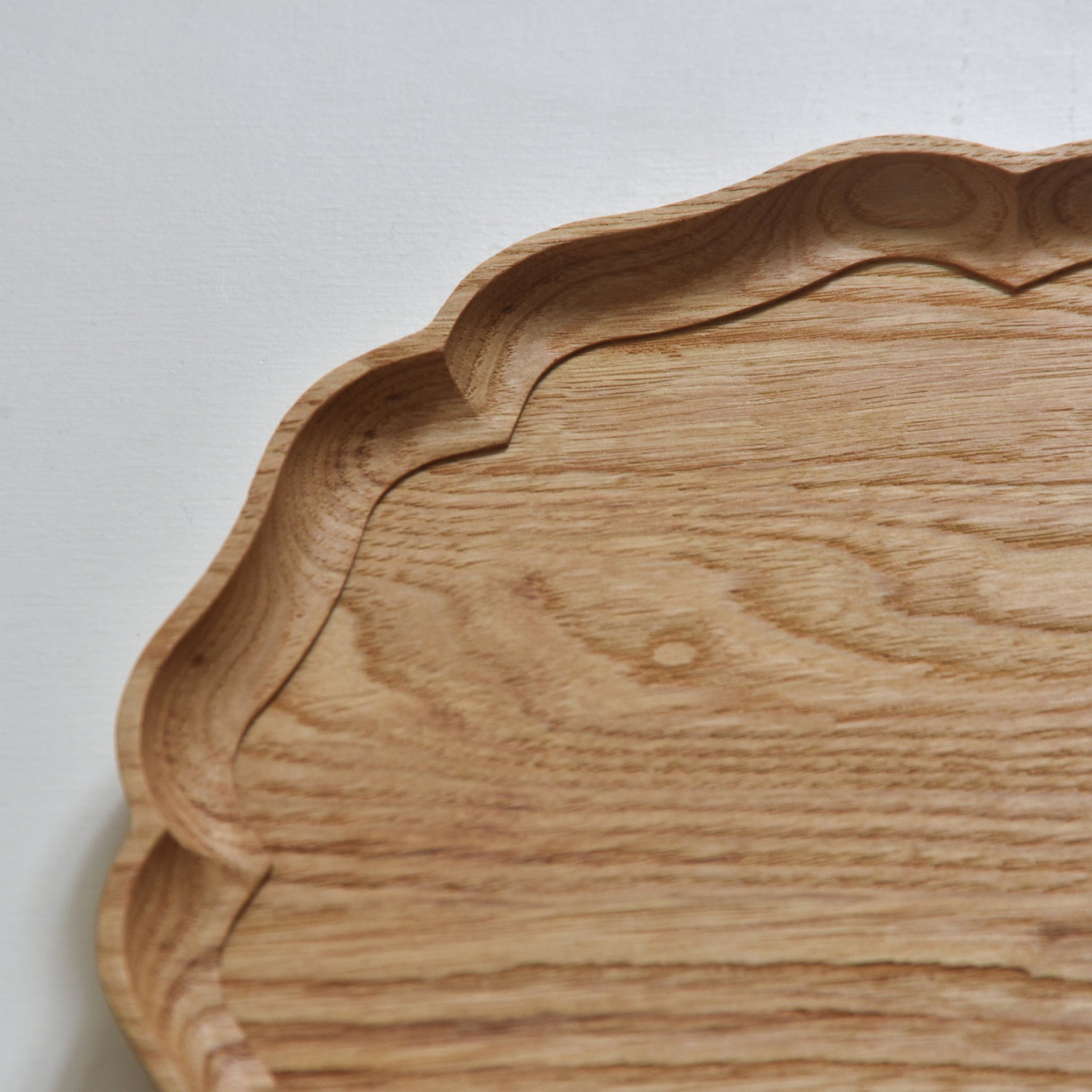 古い漆器に見られる輪花の形状を参考にした、古風な雰囲気のあるお盆です。波打つようなやわらかい形状が特徴の輪花は、もともと芙蓉の花など大輪の花をモチーフにした形状で、その優雅な形状から古来より漆器やうつわが作られてきました。山形県の木工房で栗の無垢材を削り出し、一つ一つ手作業で丁寧に仕上げております。